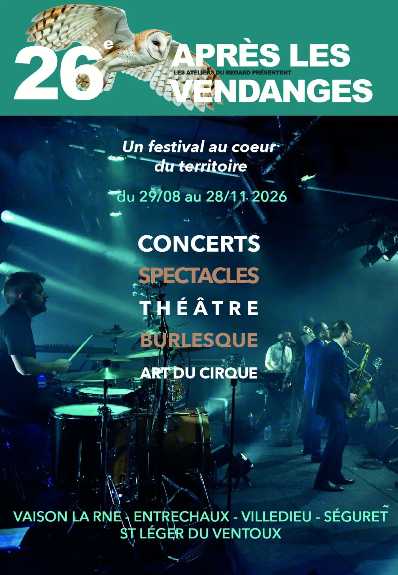 De 26e editie van het Festival Après les Vendanges wordt gehouden van 29 augustus tot 28 november 2026, met concerten, voorstellingen, circuskunsten en meer in Entrechaux, Séguret, Saint-Léger-du-Ventoux, Vaison-la-Romaine en Villedieu!