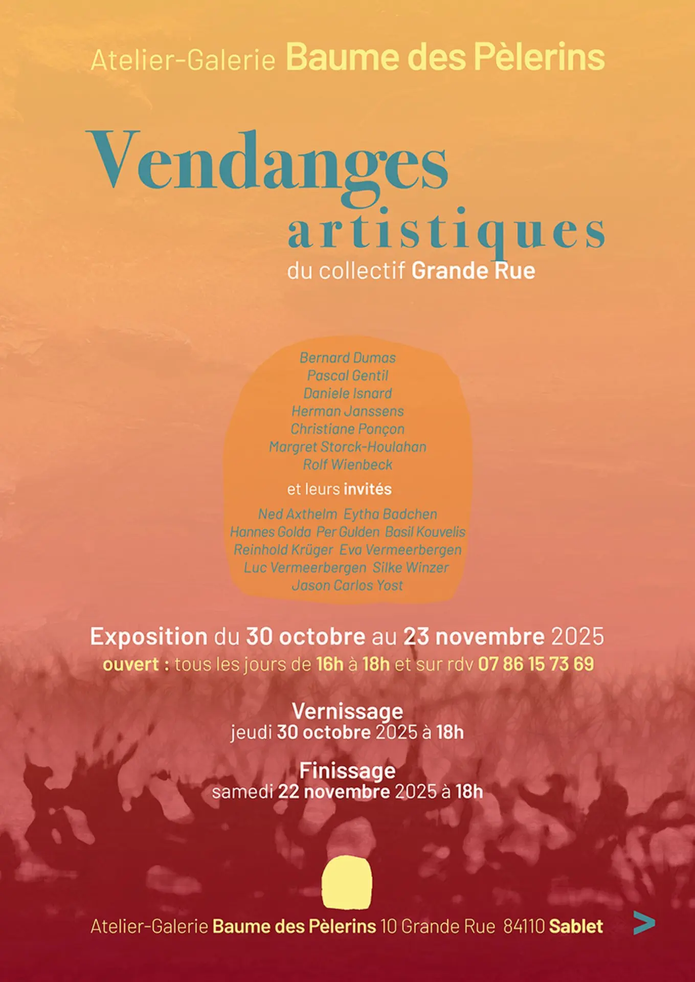 De tentoonstelling "Vendanges artistiques" brengt het collectief van de Grande Rue en hun gasten van heinde en verre samen in het hart van het Atelier-Galerie la Baume des Pèlerins: ontdek artistieke werken van schilderen tot tekenen... Opening op 30 oktober om 18u.
