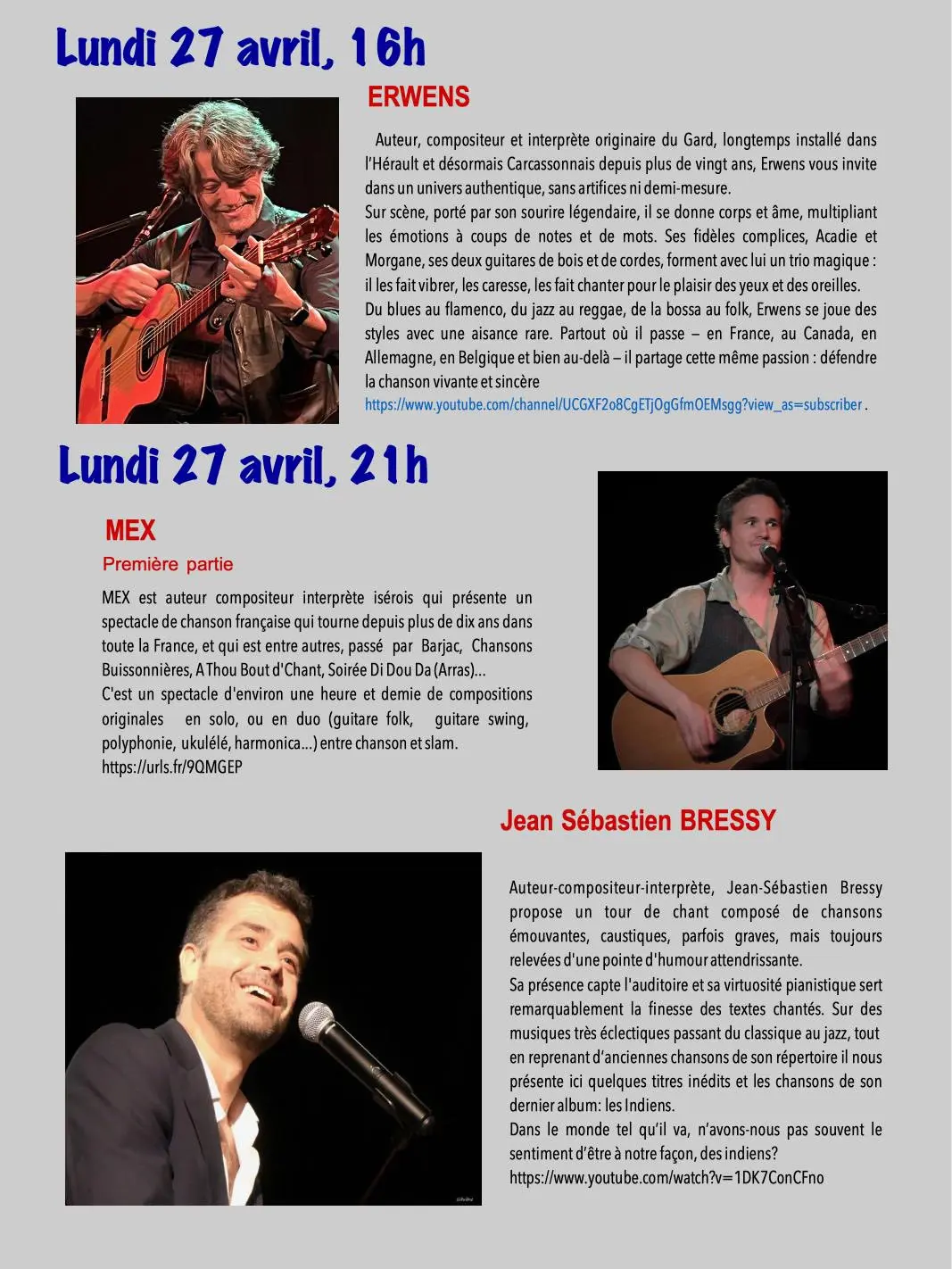 De opening is voor Mex, een singer-songwriter uit de Isère die al meer dan 10 jaar door Frankrijk toert met een Franse chanson show, waaronder optredens in Barjac, Chansons Buissonnières, A Thou Bout d'Chant, Soirée Di Dou Da (Arras) en vele anderen. De show duurt ongeveer 1 uur, met originele composities die solo of als duo worden uitgevoerd (folkgitaar, swinggitaar, polyfonie, ukelele, harmonica, enz.) en een mix van chanson en slam.