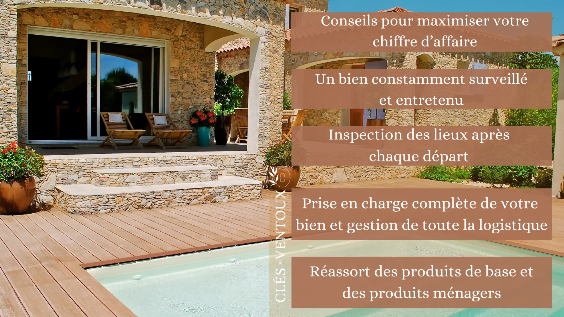 Clés du Ventoux zorgt voor alles, van reclame tot reserveringscontracten, inclusief borgsommen, inventarisatie van de formaliteiten en de organisatie van het verblijf van je gasten.