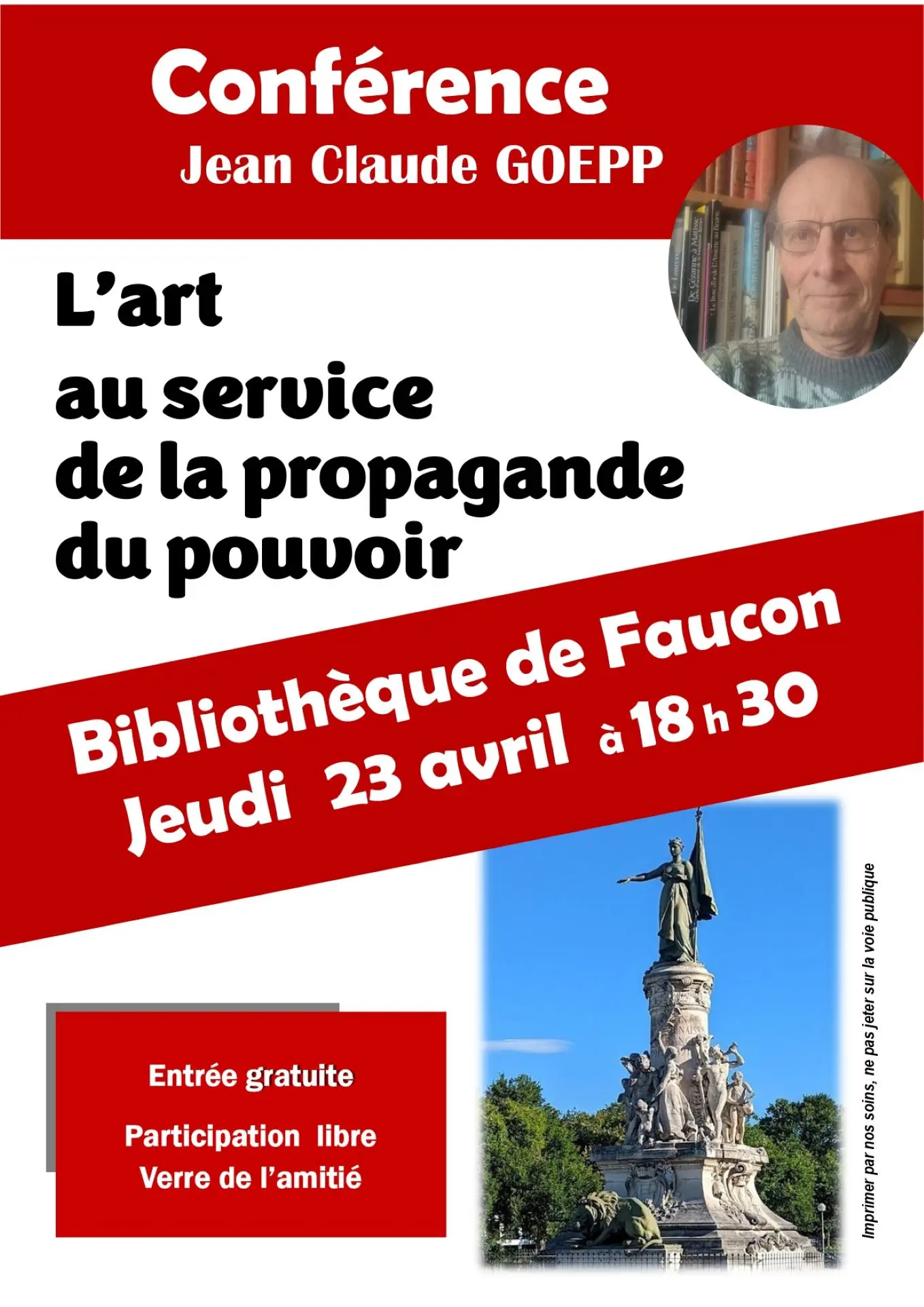 Een fascinerende lezing over het gebruik van kunst in dienst van overheidspropaganda door de geschiedenis heen. Jean-Claude Goepp zal uitleggen hoe kunstenaars een visie op de wereld vormen die wordt beïnvloed door regimes. De discussie is voor iedereen toegankelijk.