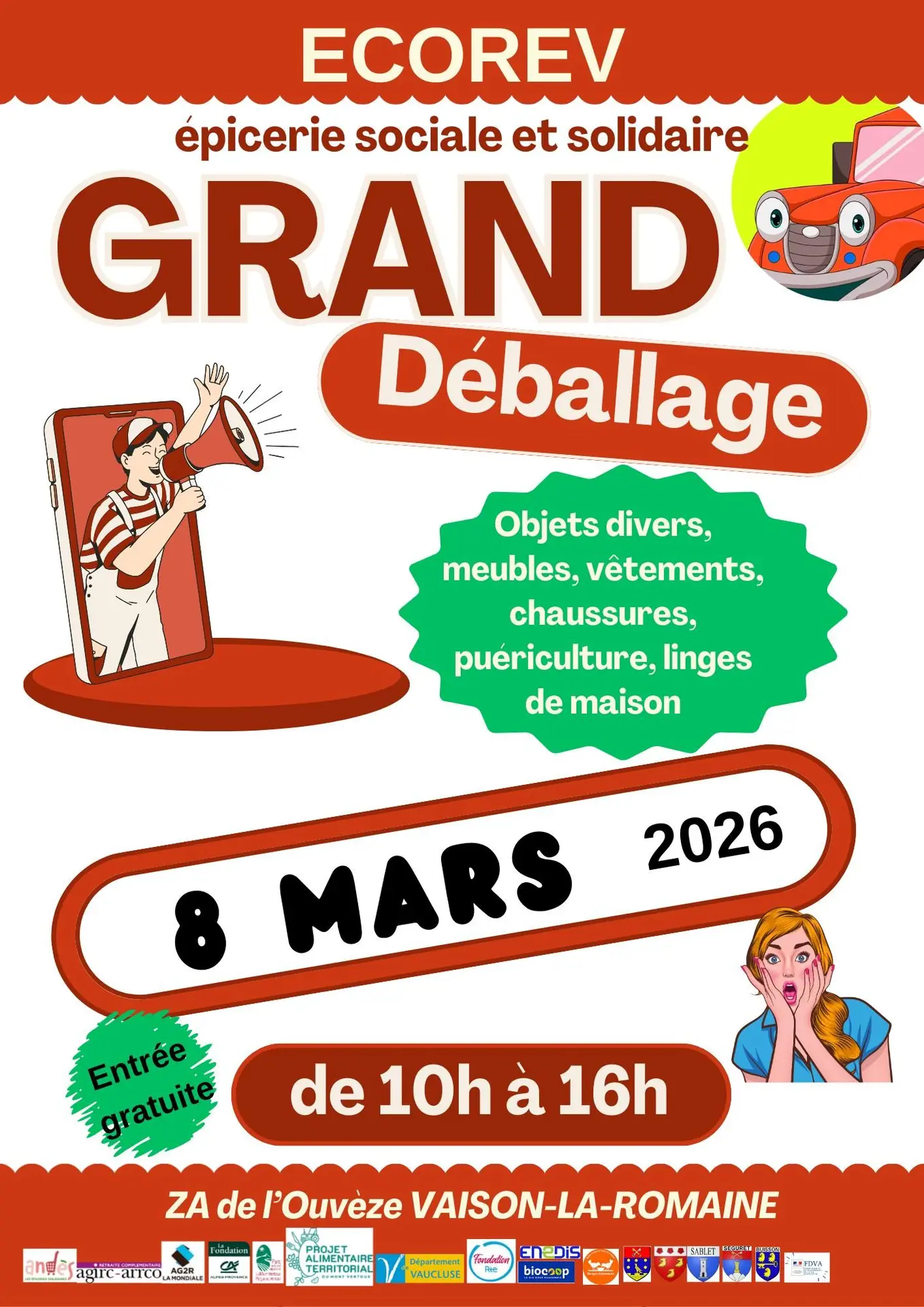 De sociale en solidaire kruidenierswinkel 'Ecorev' houdt een 'Grand Déballage'-dag. Er worden allerlei artikelen verkocht, waaronder meubels, kleding, schoenen, kinderspullen, huishoudlinnen en diverse andere artikelen.